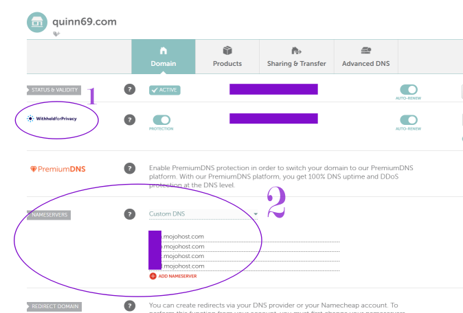 Once you’ve purchased your domain and your hosting, you need to point your nameservers to your host. Log into your domain registrar and click on ‘Manage’ (or whatever terminology your registrar uses) and first things first, before anything else, ensure you have WHOIS privacy enabled. See ‘1’ on the screencap below.