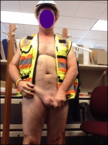 One of my favorite exhibitionist skype shows of all time occurred one weekend when he was at work and we decided he needed to take a play break, and what better way to do that than to get him naked? π Of course, I was quite concerned about him getting a chill so I dressed him up in one of his colleagues work uniform (safety first of course!), and had him model it for me in the corridors of his office.